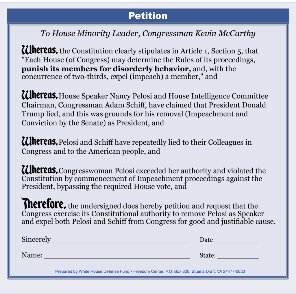 Therefore, the undersigned does hereby petition and request that the Congress exercise its Constitutional authority to remove Pelosi as Speaker and expel both Pelosi and Schiff from Congress for good and justifiable cause.